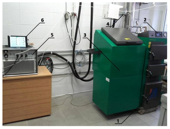 Low Emission Combustion Technologies laboratory stand: 1—Moderator Unica VentoEko 25 kW boiler, 2—controller of the boiler, 3—fuel tank, 4—exhaust sampling place, 5—MCA10 analyzer, 6—Microsoft tablet for archiving obtained measurement results.