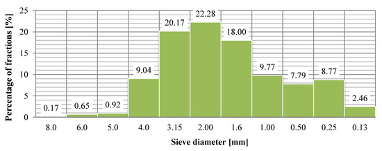 Determination of the granulometric distribution of shredded onion husk waste was carried out in accordance with [29,30], using a LPz-2e laboratory shaker from Multiserv Morek company, equipped with a set of sieves with a mesh diameter of 6, 5, 4, 3.15, 2, 1.6, 1, 0.5, 0.25, 0.125, and 0.063 mm. Each time, a sample of 100 g of the raw material was dosed into the upper sieve and the shaker was activated for 5 min. After this time, the residue that was on each of the sieves was weighed on an analytical balance. The analysis was repeated three times. The result was an arithmetic average of the tests.