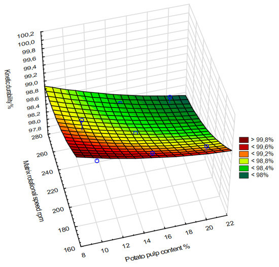 The influence of process and material factors (rotational speed of the matrix and potato pulp content) on the kinetic durability of the obtained granules is shown in Figure 6.