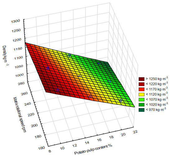 The influence of process and materials factors (rotational speed of the matrix and potato pulp content) on the density of obtained granules is shown in Figure 7.