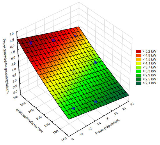 The influence of the process and materials factors (rotational speed of the matrix and potato pulp content) on the demand for granulator power of the obtained granules is shown in Figure 8.