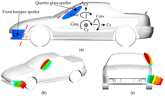 Looking at Figure 1b,c, it can be seen that the spoiler mounted behind the A-pillar can be rotated by any degree within its range of rotation without any risk of hitting a car that might be next to it, whereas in the case of the spoiler mounted on the front bumper it can only be rotated to a certain degree before it starts to protrude sideways. This makes the quarter glass an interesting location for placing a side spoiler; however, a spoiler located on the quarter glass needs to be made from a transparent material to avoid obstructing the driver’s view.