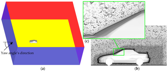 The domain used in calculations can be seen in Figure 2a with all the boundary types colored according to the legend placed beneath the figure. A “moving wall motion” was set on the wheels to include the effects of their movement in the calculations. The velocity inlet boundary type was used on the inlet surfaces of the domain, whereas the pressure outlet was used on its exit. Two sides of the domain were declared as inlets and the other two as outlets to make investigations of the different yaw angles possible. In each case, a uniform velocity profile was used with a velocity magnitude equal to 40 m/s across the whole height of the domain.