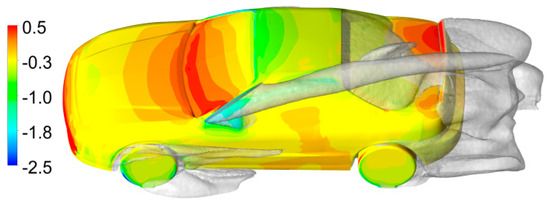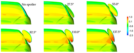 Figure 6a shows contours of the pressure coefficient for the base case without the side spoiler. To make the influence of the side spoiler clearer, contours in Figure 6b–f were included, which represent the results of subtraction of the pressure coefficient values in the base case and in each of the cases with a spoiler inclined at a corresponding angle. This way of presenting the results indicates which areas of the car body are affected most by the side spoiler. The addition of the side spoiler leads to an increase in pressure on the windshield and the roof, as well as a decrease in pressure on the side due to the vortex except for the highest angle of inclination (Figure 6f). An unexpected effect that the side spoiler entails is an increase in pressure on the trunk, which is the largest for the inclination equal to 110.0° (Figure 6e). This can be explained by the fact that the side spoiler on the quarter glass contributes to the increase of the detachment behind the car’s roof on its left side and reduces it on the opposite side, which results in an increase in the area of the stagnation zone and increases pressure on the right side of the trunk (Figure 7).