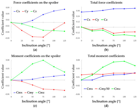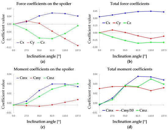 (a) Force coefficients on the spoiler, (b) total force coefficients, (c) moment coefficients on the spoiler, (d) total moment coefficients.