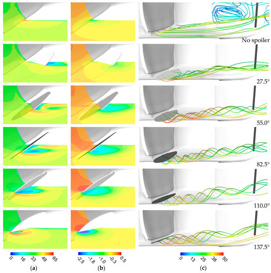 Visualizations in Figure 5a,b show how the flow field around the A-pillar is affected by the different inclination angles of the side spoiler. One can see that an increase of the inclination angle is followed by an increase in pressure difference on both sides of the spoiler and additional acceleration of the flow on its trailing edge. The only exception is for the lowest studied angle equal to 27.5° when the side spoiler generates a side force in the opposite direction than the other cases, which is caused by the overall increase in pressure behind the A-pillar due to the flow separation taking place behind the side spoiler. In Figure 5c, one can see the vortices created by the side spoiler, which are similar to the vortex created due to the presence of the A-pillar but stronger, especially for higher angles of inclination due to the increased pressure difference on both sides of the spoiler.