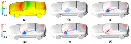 (a) Contours of pressure coefficient on the car body for the base case. Contours of pressure coefficient difference due to the introduction of the side spoiler inclined at (b) 27.5°, (c) 55.0°, (d) 82.5°, (e) 110.0°, and (f) 137.5°.