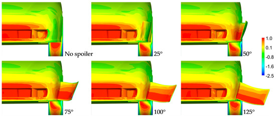 Looking at the contours in Figure 8, it can be seen that the biggest differences in pressure distribution occur in the direct vicinity of the spoiler. Due to the fact that the spoiler is located in the area affected by the build-up of pressure taking place at the front of the bumper, the inside of the spoiler is subjected to high pressure even when the spoiler is inclined at a low angle. The pressure distribution on the outer side of the spoiler is subjected to bigger changes due to the fact that at lower angles, it faces the flow, whereas at higher angles, it is in the wake created by the side spoiler.