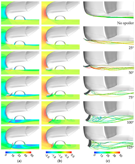 In Figure 10a, a detachment of the flow from the car body can be observed at angles above 75°, whereas at lower angles, the flow accelerates on the outer side of the spoiler and remains attached to the car body, which is consistent with the streamlines depicted in Figure 10c, where it is shown that the vortices created on the side spoiler inclined up to 50° stay attached to the side of the car. The highest drop in pressure on the outer side of the spoiler is observed at inclination angles equal to 50° and 75° (Figure 10b) due to the acceleration of the flow in that region. When a complete separation takes place, the pressure increases but is still lower than without the side spoiler.