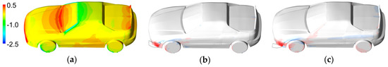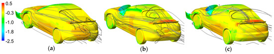 Three car body geometries were chosen for comparison across different yaw angles, a model with two additional side spoilers (Figure 12a), the base case model (Figure 12b), and a model with the spoiler removed on the trunk (Figure 12c). This set of cases makes it possible to compare how a typical aerodynamic enhancement, such as a rear spoiler placed on a car’s trunk, can improve the aerodynamic properties of a car in comparison with an unconventional method, such as the addition of side spoilers. The angle of inclination of the side spoilers was kept the same across all studied yaw angles, the side spoiler at the quarter glass was inclined at 110°, and the side spoiler at the bumper was inclined at 50°. In the case of the spoiler at the quarter glass, it is possible that adjusting its angle of inclination would be beneficial, and the angle should be decreased with an increase of the yaw angle. In the case of the side spoiler located on the quarter glass, the most efficient variant investigated at a zero yaw angle was selected (inclination angle equal to 110°), and in the case of the spoiler located at the front bumper, the highest inclination angle deemed acceptable was equal to 50° as this meant that the side spoiler did not significantly protrude outside the car body.
