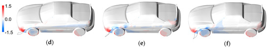 The most significant differences in the pressure distribution (Figure 11) occur in the direct proximity of the spoiler, which can be observed as the pressure increases in front of it and decreases behind it. This area increases in size above the inclination angle equal to 75° and is the greatest at 125° (Figure 11f) when it stretches up to the A-pillar. It can be clearly seen that this area is much more confined in comparison with Figure 7 representing the change of pressure distribution for the case of the spoiler located at the quarter glass. It should be noted that at the angles of inclinations equal to 25° and 50° (Figure 11a,b), the pressure increases exactly between the side spoiler and the front wheel. This occurs because the inclination angle is too small to detach the flow, which leads to a pressure build-up in that region. This effect lowers the efficiency on the side spoiler and decreases the side force, as well as the yawing moment, which can be seen in Figure 9b as the absolute value of the side force decreases at an angle equal to 50°. Even more important is that the increase in pressure on the car body in front of the spoiler has the same effect and occurs on an even larger area. For this reason, the yawing moment generated on the whole car body is lower than the yawing moment generated on the side spoiler itself (Figure 9c,d). To solve this problem, the side spoiler could be either moved to the front or its rotation axis could be switched from the trailing edge of the spoiler plate to its leading edge to ensure that the activation of the spoiler decreases pressure on the side of the car body.