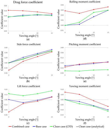 where vehicle dimensions such as height (H), boot height (Hte), frontal area (A), and length (L) are considered. Taking into account all of those dimensions makes it possible to predict the side force more accurately; however, as identified in [24], vehicle height has the most dominant influence on the side force. The side force derivative in Equation (4) represents the change of side force coefficient with the yaw angle. It was concluded in [24] that the yaw moment could not be predicted with a similar formula due to its high sensitivity to the distribution of the side force load. The case without the rear spoiler was chosen for comparison with the results from the analytical calculations and the ones obtained with the use of CFD, and, in Figure 14b, one can see that the formula matches the CFD results very closely throughout the studied yaw angle range.