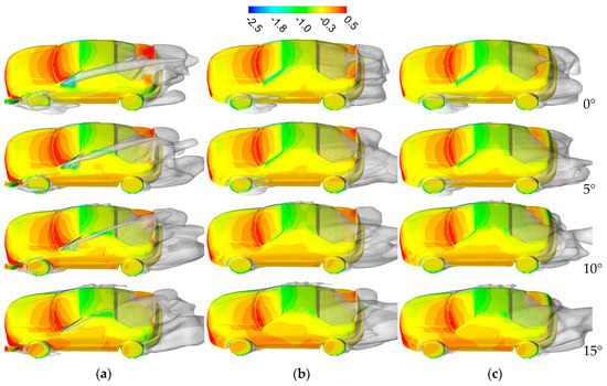 Contours of pressure coefficient on the car body and iso-surfaces of total pressure equal zero for consecutive yaw angles for the (a) combined case, (b) base case, and (c) clear case.