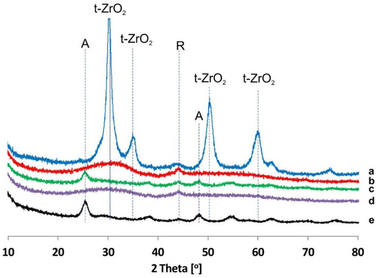 X-ray diffraction analysis was also carried out to obtain the structural information of synthesized zirconia, titania, and bioxide systems obtained via the alginate route. Powder wide angle XRD patterns for the studied catalysts are shown in Figure 1.