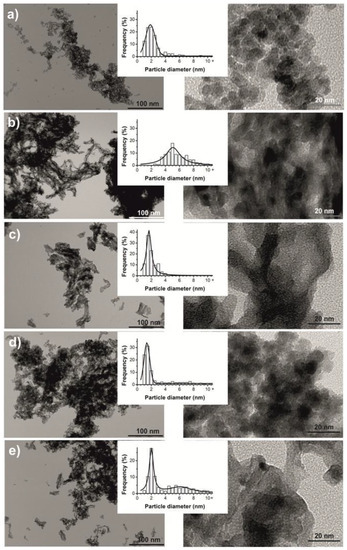 TEM images of Ru catalysts with Ru particle size distribution. (a) Ru/TiO2; (b) Ru/ZrO2; (c) Ru/ZR-1; (d) Ru/ZR-2; (e) Ru/ZR-3.