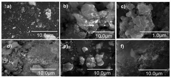 SEM images of Ru catalysts: (a,c) Ru/ZrO2; (b) Ru/TiO2; (d) Ru/ZR-1; (e) Ru/ZR-2; and (f) Ru/ZR-3.