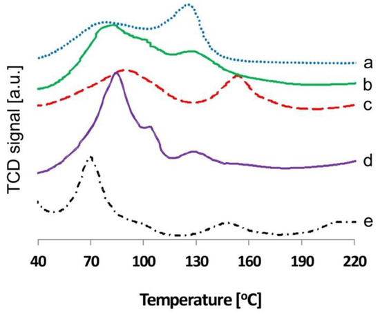 The reducibility of investigated catalysts was examined by TPR (Figure 4). For Ru/TiO2, we observed the main reduction sharp peak at very low temperatures of around 70 °C, which can be assigned to RuO2 in the case of very weak or no interaction with the support or amorphous RuOx. At higher temperatures, the shoulder with maximum at 145 °C can probably be assigned to crystalline, well-dispersed RuOx in strong interaction with titania [26,27,28].