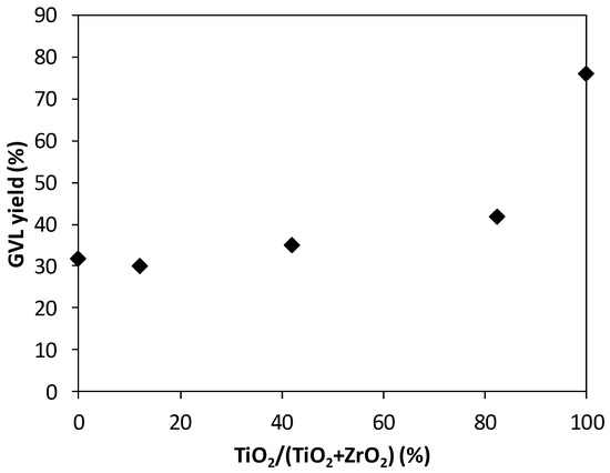 These differences of activity for investigated catalysts can be traced back to the composition of the catalysts, particularly the Zr/Ti ratio on the surface and in the bulk, which is a key factor. Subsequent catalyst properties can directly originate from that. As it was illustrated on the Figure 5, there is a clear relationship between GVL yield and titania contribution. By increasing the titania content reaction, yield is enhanced.