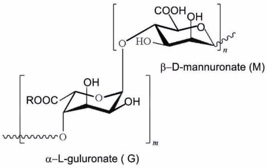 Structure of alginate (M—mannuronate unit; G—guluronate unit), where R is Ca (calcium alginate) or Na (sodium alginate).
