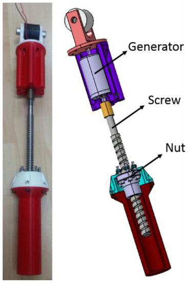 The Ball-Screw Energy Harvesting Shock Absorbers (BS-EHSA) as the name implies, uses a ball-screw transmission system to go from translation into rotation. Figure 2 shows an example of this type of shock absorber, which is composed of a nut, a screw, and a coupled generator. Table 2 specifies the design parameters of this type of damper.