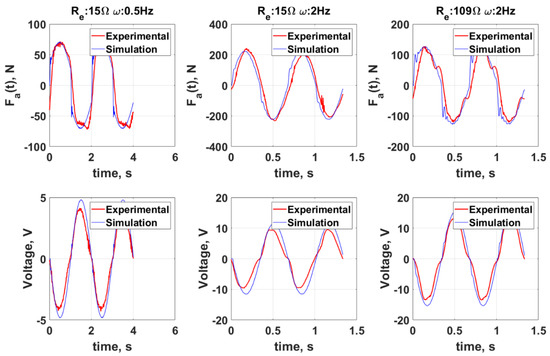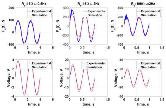 Figure 4 shows some of the simulations and experimental results, which show that the computational model is able to reproduce the force and the voltage results obtained in the experimental setup.