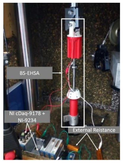 Figure 5 shows the test bench used for the BS-EHSA prototype (an MTS 835 machine). The tests were run between 0.5–3 Hz using different load electrical resistances (15, 47, 62, 94, and 109 Ω). The acquisition system is composed of a CompactRio NI cDaq-9178 module and a NI-9234 module. The results of the experimental tests can be seen in Figure 6. The graphs show that, as indicated by the equations, when the excitation frequency increases or when the external load decreases, the energy recovered by the BS-EHSA increases. Additionally, it can be seen that the damping coefficient will depend on the resistance that is connected to the generator.