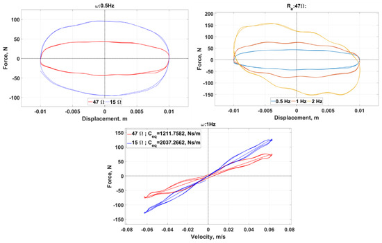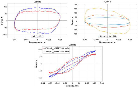 Top-Left: Force-displacement loop at different electrical loads. Top-Right: Force-displacement loop at different excitation frequencies. Bottom: Force-velocity graph at 0.5 Hz and 10 mm amplitude for 15 and 47 ohms.