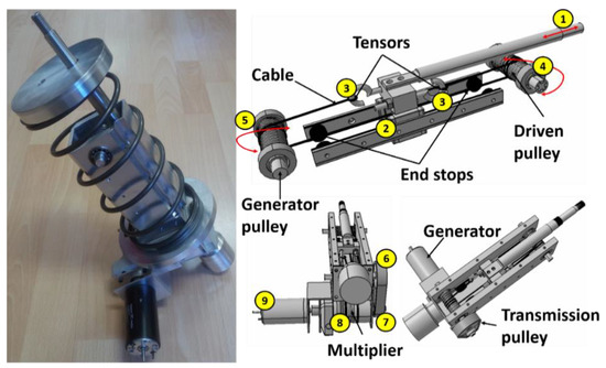 The Cable-Dynamic Energy Harvesting Shock Absorbers (CD-EHSAs) use a steel cable and a pair of pulleys as the main element for the translational into rotational conversion. Figure 7 shows an example of such a shock absorber. The translation movement of the suspension is transferred through a piston (1) to a sliding part running on linear guides (2). The sliding part has two preloaded cables (3) that displace it. The cable is connected in one end to a driven pulley (4) and to the other end to a generator pulley (5), which is connected to another larger pulley (6). This one is connected through a band to a smaller pulley (7) that doubles the rotational speed. The smaller pulley is rigidly assembled to a multiplier (8) connected to an electric generator (9). Table 3 specifies the design parameters of this type of shock absorber.