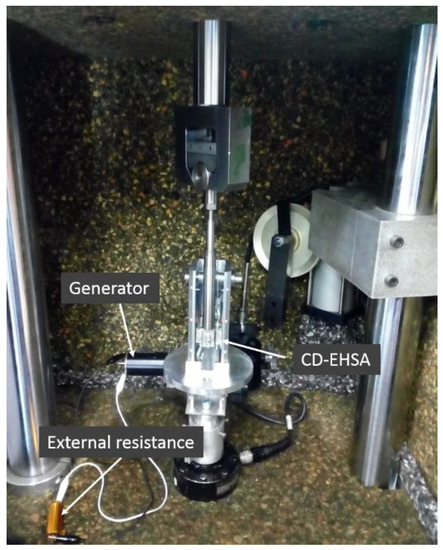 Experimental tests were also run in the MTS 835 machine (Figure 10). The results are presented in Figure 10. The same excitation frequencies and loads as in the BS-ESHA case were used. The tests were carried out for the same excitation frequencies and resistance load as in the case of the BS-EHSA. Obtained for each were the damping force values and the generator voltage. Figure 11 shows, as for the BS-EHSA, that the behavior of the CD-EHSA is affected by changing both the excitation frequency and the external load that is connected to the generator.