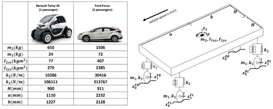 Left: Geometric, mass, and inertia properties of both vehicles (Renault Twizy and Ford Focus). Right: Full vehicle model of a 7 DOF having EHSAs instead of the damper systems.