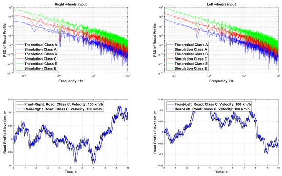 where , is the distance between the front and rear wheel. In Figure 13 you can see the logarithmic graph of the PSD of the three types of road, both for the right and left wheels. The graphs show that the signals generated as input to the complete car system have the same theoretical slope as stipulated by ISO 8608. In the same figure, an example of a road profile is shown, driving at 100 km/h in a class C profile (Table 4).