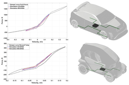 Force-velocity curve from the CD-EHSA, BS-EHSA, and the vehicle’s damper. Top: Ford Focus. Bottom: Renault Twizy.
