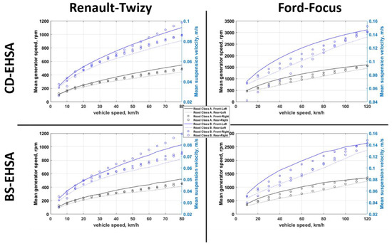Generator speed from the CD-EHSA and BS-EHSA and the relative velocity in the four suspension system of the Renault Twizy and Ford Focus.