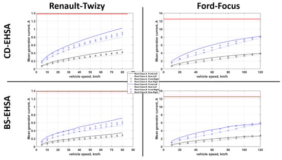 Generator current from the CD-EHSA and BS-EHSA in the four suspension system of the Renault Twizy and the Ford Focus. The red line indicates the maximum current of the generator.