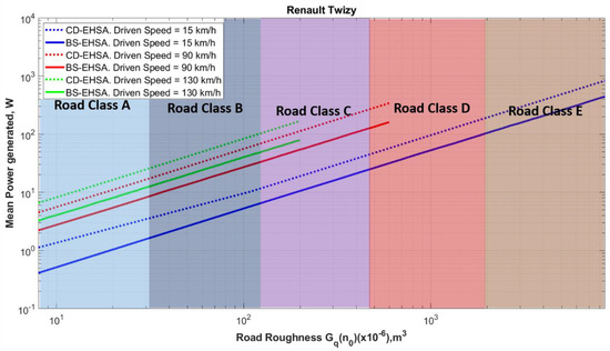 With the conditions described in the previous section, Figure 17 and Figure 18 show an estimation of the average power that can be generated with both EHSAs in the Renault Twizy and/or the Ford Focus. From the graphs, it can be seen that the power level increases with the speed of the vehicle and the roughness of the pavement.