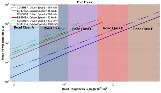 Mean power generated from the BS-EHSA and CD-EHSA on a Ford Focus at different driving speeds and road roughness. The results take into account the four EHSAs.