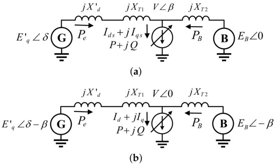 By representing SG with the classical model [33], neglecting the resistance of SG and transmission line, and using the STATCOM model in Figure 1, the system representation of Figure 2 is as shown in Figure 3a. Here, the terminal voltage of infinite bus is set as the reference phasor; is the quadrature-axis transient voltage of SG; is the d-axis transient synchronous reactance of SG; and are the reactance of the transmission line, is the total reactance of the transmission line and ; P and Q are the absorbed active and reactive power of STATCOM respectively.