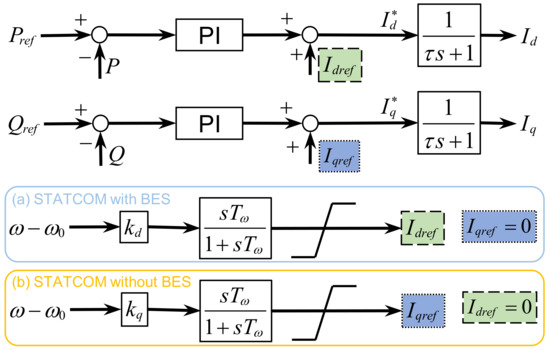 According to previous analysis, both STATCOM with and without BES are capable of influencing the electrical power of SG, and the deviated value () is determined by STATCOM’s active and reactive current. Based on this, a current-based damping control strategy is presented for STATCOM with and/or without BES to increase SG’s damping and thus enhance system’s oscillation damping performance.