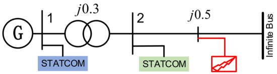 In this section, the single machine infinite bus (SMIB) system is adopted to analyze the transient interactions between STATCOM and SG’s electrical power. The second order model of SMIB system is able to capture the dynamical characteristics and behaviors of power systems. Therefore, it has been widely used in the analysis and control of electromechanical oscillations [32,33,38]. As shown in Figure 2, the SMIB system is composed of a SG and an infinite bus, which are connected through a transmission line. The infinite bus has constant voltage magnitude and angle. The STATCOM is employed in the transmission line to investigate the transient interactions between STATCOM and SG.