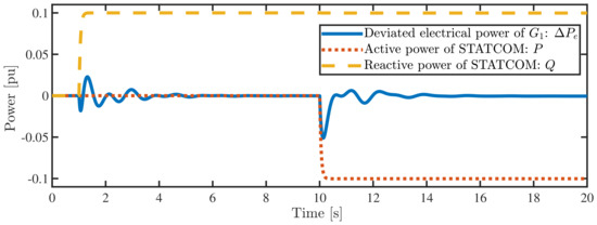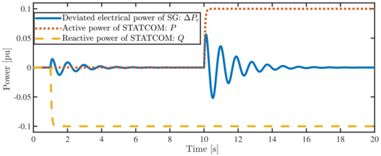 In the first test, the mechanical power of is kept unchanged in order to show that . The initial reactive and active power of STATCOM are all zero and step to pu and pu, at s and s respectively. As can be seen from Figure 9, the deviated electrical power of G is 0 before s when P and Q are both unchanged. When the active power of STATCOM is stepped up to pu at s, the electrical power of SG is deviated () and the deviated value . When the reactive power of STATCOM is stepped down to pu at s, is also changed even though P is kept unchanged, and the deviated value .