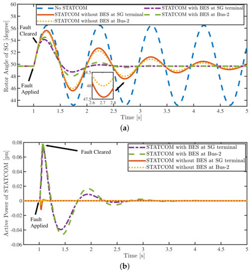 Figure 7 shows the results of this system with STATCOM with/without BES at different locations. The rotor angle is increasing when the fault is applied at (seen from Figure 7a). After the fault is cleared, the system presents different behaviors under different scenarios. It should be mentioned that, at Bus-2, is approximately equal to . Thus, Bus-2 should be the optimal location for STATCOM without BES according to (33).