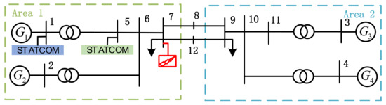 The diagram of this system is shown in Figure 8. This test system is a multimachine power system with two areas, four generators, two loads, 12 buses and is suggested in [42] for testing the analysis and control of power system inter-area oscillations. In the simulation model, the SGs are using the subtransient reactance generator model and each of them is carried with an automatic voltage regulator, a DC exciter and a PSS. Thus, this simulation model is more detailed and realistic than our previous analytical model (i.e., SMIB model). The system parameters, such as the generator data, transmission line data, load data, can be seen in [33]. In this case study, G is equipped with a STATCOM with/without BES to increase its damping, and it is placed at the terminal or at the transformer. The control parameters of STATCOM are set as s, and the time constant in (2) are all set as ms.