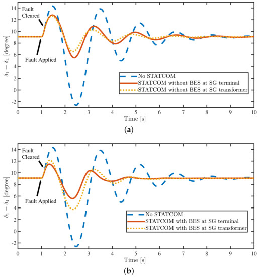 Secondly, the damping coefficient of SG is set as to emphasize the results. In this case, a one-cycle three-phase fault is applied, as indicated in Figure 5. The washout block time constant is s. The control parameters for STATCOM with/without BES are set with the same value, i.e., . The STATCOM with and without BES are employed at the terminal of SG or Bus-2, shown in Figure 5. The time constant in (2) are set as ms for both STATCOM with and without BES.