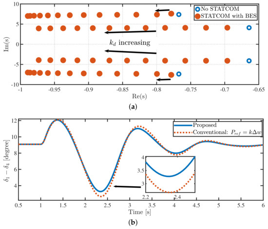 A further small-signal stability analysis of STATCOM with BES (installed at the optimal location, i.e., the terminal of SG) under different is shown in Figure 11a. When there is no STATCOM installed, the system’s dominant eigenvalues are indicated by the blue dots in Figure 11a. When installed with a STATCOM with BES, the system’s dominant eigenvalues are all on the left side of no STATCOM, indicating that the system’s damping is increasing. Meanwhile, with increasing from 5 to 60, the dominant eigenvalues of the system are gradually moving leftward (marked by the black arrows), indicating that the system’s damping is increasing. The above observation verifies the previous analytical results of the influence of STATCOM on SG (i.e., Equation (8)). Figure 11b compares the proposed damping controller with conventional type damper [43] under the same gain parameter. As can be seen from the black arrow, the oscillation of proposed strategy is less than that of conventional method, indicating the superiority of proposed strategy.