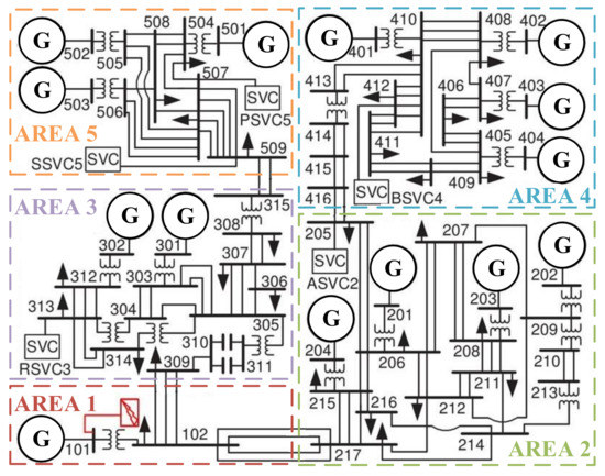 The previous analytical results are further validated on a five-area large power system. This test system has 14 generators, 59 buses and 29 loads, and the oscillation modes include both local and inter-area. In the simulation model, each SG is deployed with a turbine governor and a muilti-band PSS with parameters tuned from [44]. The system parameters and the used simulation model can be downloaded from [44]. Besides, each generator is equipped with a STATCOM with/without BES to increase its damping, placing at the terminal or transformer. To activate the local and inter-area oscillations, a five-cycle three-phase fault is applied at the terminal of at s, shown in Figure 12.