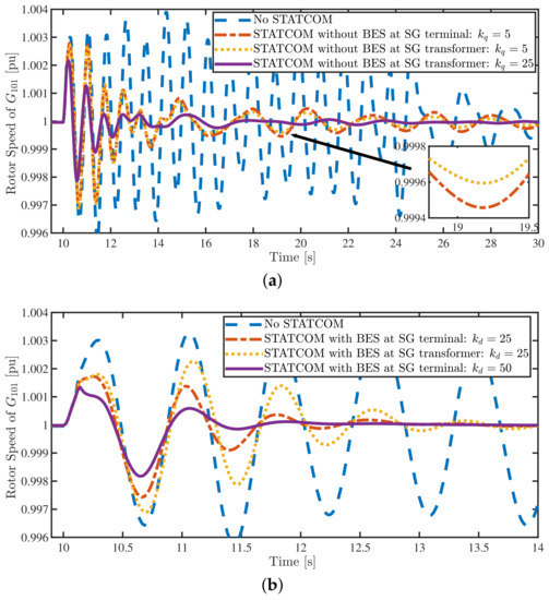 Figure 13a depicts the trajectory of the rotor speed of G in the case of no STSTCOM and STSTCOM without BES. As can be seen, the system’s oscillation is poorly damped when no STATCOM is employed. When the STATCOM without BES is installed at SG terminal with , the oscillation is damped with much smaller fluctuations. Meanwhile, in the location of SG transformer, the oscillation is damped with slightly less fluctuations than that of SG transformer (indicated by the black arrow in Figure 13a). When is increased from 5 to 25, the oscillation is mitigated with further smaller overshoot and the stabilize time is reduced to at s.