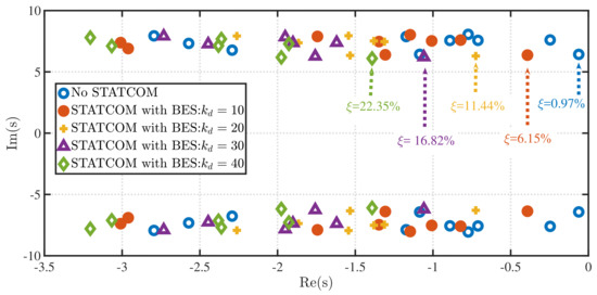 A further study of the dominant eigenvalues of this system with STATCOM with BES (installed at the optimal location, i.e., the terminal of SG) is shown in Figure 14. As can be seen, when there is no STATCOM installed, the system’s damping ratio is only (indicated by the blue arrows). When installed with STATCOM with BES, the system’s rightmost eigenvalue (indicated by the arrows) is moving leftward, indicating that the system’s damping ratio is also increased. Meanwhile, with increasing from 10 to 40, the system’s damping ratio is increased from to . This further validates the correctness of Equation (8).