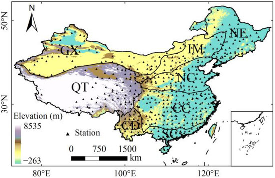 This study is conducted over mainland China, located within 73°41′–135°02′ E and 18°10′–53°33′ N. The geography of mainland China is variable and the topography has obvious regional differences. The climate types of mainland China include monsoon climate, continental climate, alpine climate and so on [41].