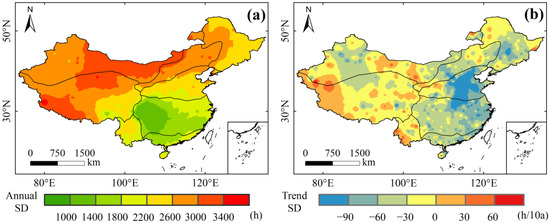 Spatial distribution of (a) annual SD and (b) climate tendency rate in mainland China during 1961–2016.