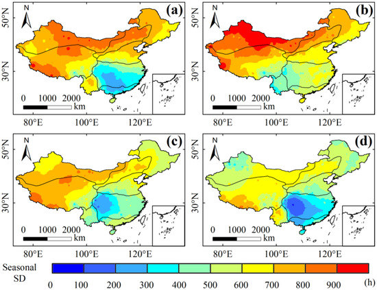 The spatial distribution of SD for each season is further depicted in Figure 3. SD was the largest in summer, followed by spring and autumn, and the lowest SD occurred in winter. The spatial patterns in spring, autumn and winter were similar to annual distribution, but with different magnitudes. The region with the lowest SD in summer was located around the Chuan-Dian Area (CD) affected by the monsoon. The longest SD occurred in GX in all seasons except in winter due to the high-elevation and low-precipitation, with the largest SD in summer of more than 890 h [52]. In winter, the highest SD was found in QT due to low latitude and the highest elevation; however, the lowest SD occurred in the west regions of CC.